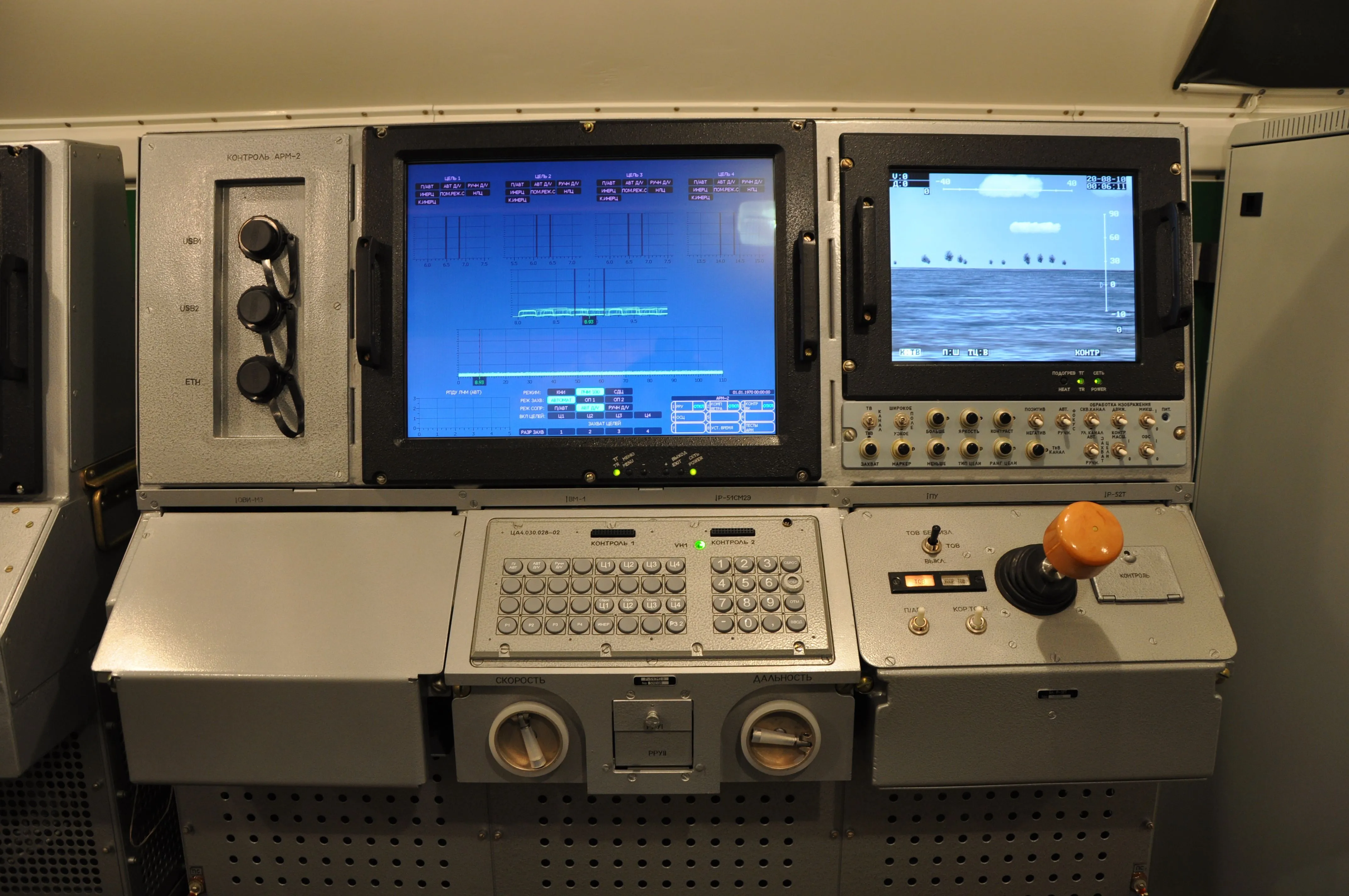 - Внешний вид, состав и размещение аппаратуры рабочих мест обучаемых боевых расчетов СОУ, КП и СОЦ максимально приближены к составу, внешнему виду и размещению данной аппаратуры в реальных изделиях. Используется реальное программное обеспечение СОУ, КП и СОЦ, адаптированное для применения в тренажерах