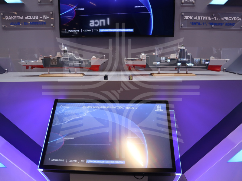 На интерактивном презентационном комплексе «Алмаз – Антей» представил информацию о зенитных ракетных комплексах (ЗРК) «Ресурс» и «Штиль-1», размещаемых на кораблях различного водоизмещения. Многоканальный ЗРК самообороны кораблей малого водоизмещения «Ресурс» предназначен для защиты надводных кораблей от атак пилотируемых и беспилотных средств воздушного нападения на ближнем рубеже, в том числе летящих на предельно малых высотах. В состав комплекса входят ракеты 9М96Е и 9М100Е. ЗРК «Штиль-1» предназначен для всенаправленной коллективной обороны соединений кораблей и конвоев судов и для всенаправленной индивидуальной защиты кораблей от атак противокорабельных ракет, самолетов, вертолетов, катеров и кораблей. Комплекс оснащается зенитной управляемой ракетой 9М317МЭ.