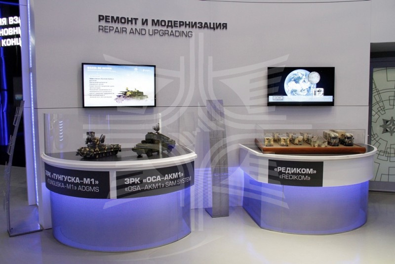 На открытой экспозиции Концерна внимание гостей и участников Форума было направлено на зенитную ракетную систему С-400 "Триумф", изделия из составов зенитного ракетного комплекса "Тор-М2ДТ" и пункта наведения истребительной авиации "Горизонт Э", радиолокационные станции (РЛС) "Небо-СВУ", "Противник-ГЕ", РЛС 1Л261 из состава комплекса "Зоопарк-1М", межвидовой радиопеленгационный метеорологический комплекс "Улыбка-М", азимутально-дальномерный радиомаяк системы РСБН "Тропа-СМД", автономный тренажер командира и оператора 9Ф678М изделия 9А331М.