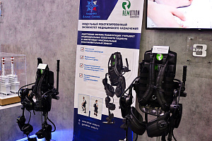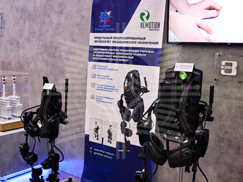 АО «Волжский электромеханический завод» показало роботизированные экзоскелеты Remotion, которые служат для реабилитации пациентов с нарушением подвижности нижних конечностей. Модульная конструкция экзоскелета позволяет быстро отключать или подключать модули стопы, голени и бедра в любых допустимых сочетаниях в зависимости от заболевания и физического состояния пациента.