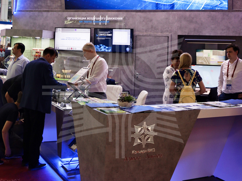 На экспозиции Концерна в павильоне «С» можно было увидеть натурные образцы и модели инновационной продукции гражданского и двойного назначения для различных отраслей. Значительная часть экспозиции посвящалась оборудованию для организации воздушного движения и обеспечению его безопасности. Так, ПАО «НПО «Алмаз» продемонстрировало модели доплеровского метрологического радиолокатора «ДМРЛ-3», радиолокационных комплексов «Сопка-2» и «Лира-А10», радиолокационно-оптического комплекса обеспечения безопасности объектов и нейтрализации беспилотных летательных аппаратов «ROSC-1». Также была представлена информация о РЛС «Утес-ТМ», «Лира», «Лира-ВМ», «Лира-ВМЭ», комплексе средств автоматизации «Вега», наземной станции системы автоматического зависимого наблюдения «СНП-Л АЗН-В», аэродромных многопозиционных системах наблюдения «Тетра» и «Тетра-М». АО «Всероссийский научно-исследовательский институт радиоаппаратуры» продемонстрировало макеты наземной станции АЗН-В с секторной антенной, всережимной цифровой станции наблюдения для управления воздушным движением МВРЛ «Аврора-2», мобильной системы вещательного автоматического зависимого наблюдения 1090ES «Мангуст» и натурный образец рабочего места диспетчера по управлению воздушным движением. ПАО «Радиофизика» представило модели безэховой экранированной камеры и земной станции спутниковой связи «МОСТ-УС».